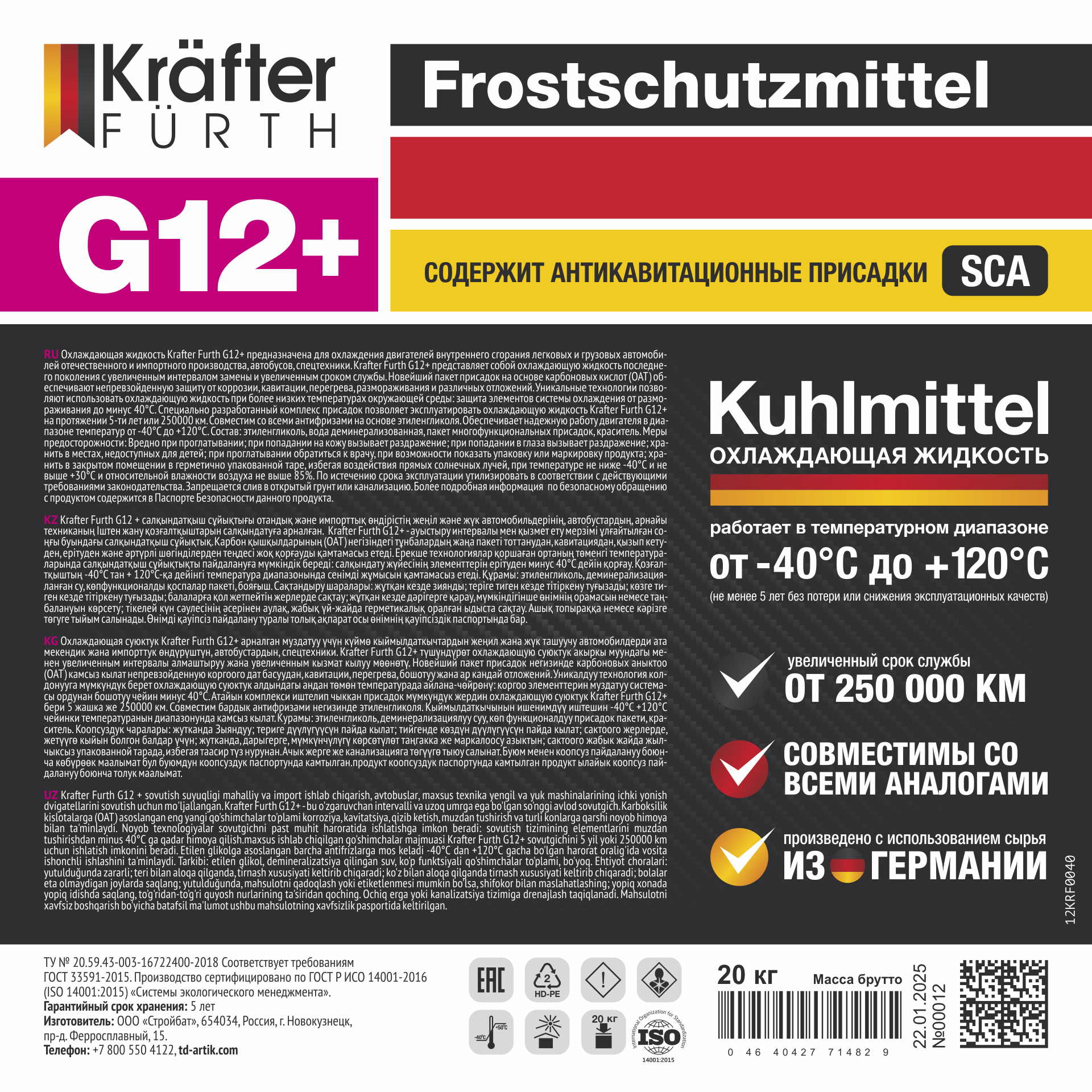 Охлаждающая жидкость KRAFTER FURTH Антифриз G12+ розовый предназначена для охлаждения двигателей внутреннего сгорания легковых и грузовых автомобилей отечественного и импортного производства, автобусов, спецтехники.  KRAFTER FURTH Антифриз G12+ розовый представляет собой охлаждающую жидкость последнего поколения с увеличенным интервалом замены и увеличенным сроком службы.